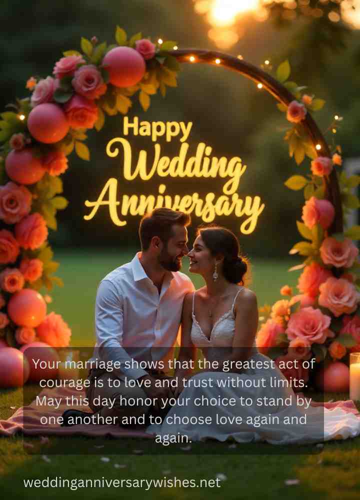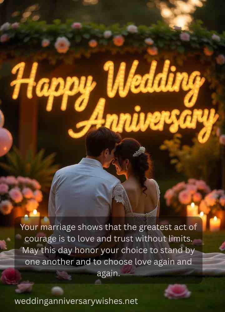 Your marriage shows that the greatest act of courage is to love and trust without limits. May this day honor your choice to stand by one another and to choose love again and again.