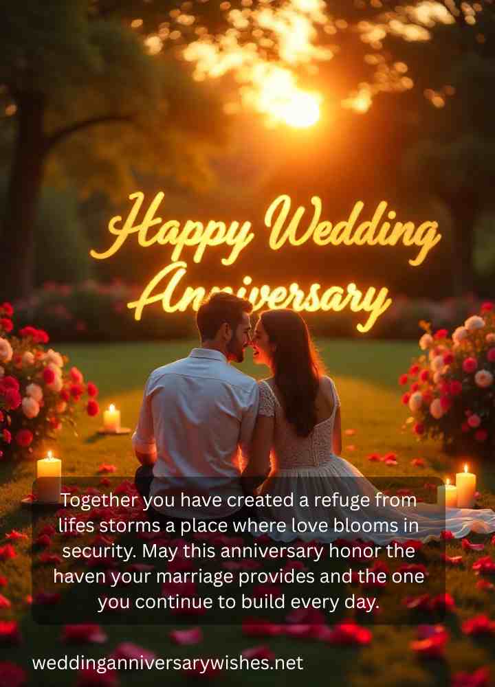 The peace you have found together has created a sanctuary of love that protects you from lifes storms. May this anniversary celebrate the safe haven you have built through your devotion to one another.