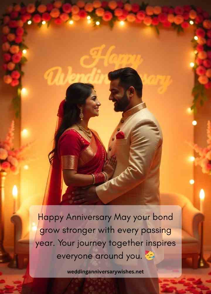 Happy Anniversary May your bond grow stronger with every passing year. Your journey together inspires everyone around you. 🥳